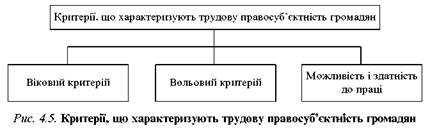 Трудова правосуб’єктність громадян. Трудову правосуб’єктність громадян характеризують такі критерії (рис. 4.5).