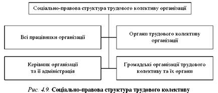 Суб’єктом самоуправління є трудовий колектив, а об’єктом його управління — організація, соціальний розвиток трудового колективу. Трудовий колектив організації має складну соціально-правову структуру (рис. 4.9).