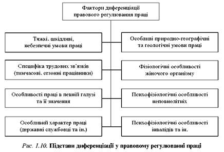 Диференціація правового регулювання праці здійснюється за певними факторами, які враховуються законодавцем при нормотворчості (рис. 1.10).