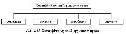 Трудове право виконує регулюючу та охоронну функцію, а також специфічні для трудового права функції (рис. 1.11).