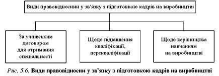 Правовідносини у зв’язку з професійною підготовкою кадрів безпосередньо на виробництві. Ці правовідносини передують трудовим відносинам чи є похідними від них і можуть бути трьох видів (рис. 5.6).