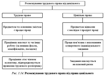 У трудовому праві управлінські форми організації не виходять за межі спільного процесу праці в організації. Відносини працівників мають характер виробничих, а не адміністративних відносин. Предметом трудового права є відносини щодо здійснення виконавчо-розпорядчої діяльності державних органів. З адміністративним правом трудове право суміжно пов'язано, наприклад, наявністю працівників, які навчаються без відриву од виробництва. Відносини ці регулюються нормами адміністративного права, а надання пільг у зв'язку з навчанням — трудовим законодавством.