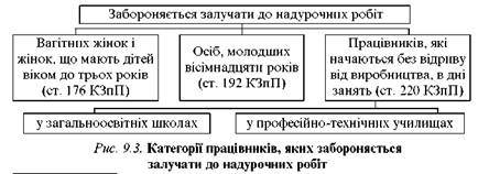 Категорії працівників, яких згідно зі ст. 62 КЗпП забороняється залучати до надурочних робіт, наведено на рис. 9.3.