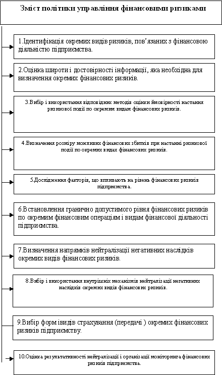 Політика управління фінансовими ризиками являє собою частину загальної фінансової стратегії підприємства, яка полягає в розробці системи міроприємств по нейтралізації можливих фінансових наслідків ризиків пов’язаних із здійсненням різноманітних аспектів фінансової діяльності.