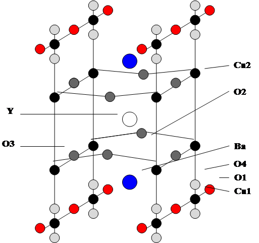Практично всі ВТНП мають слоїсту структуру типу перовскіта з площинами із атомів Cu і O. На рис1.1.1 показана структура типового широко розповсюдженого високотемпературного