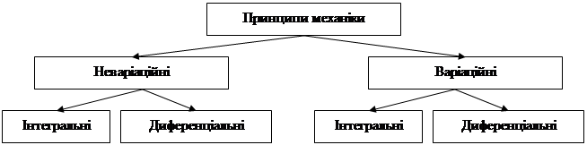 Усі принципи механіки поділяються на неваріаційні і варіаційні. І ті й інші, у свою чергу, підрозділяються на диференціальні й інтегральні принципи (див. схему).