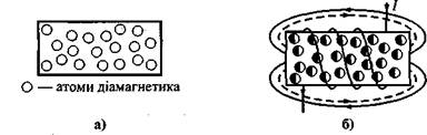 Речовини, атоми яких власного елементарного магнітного поля не мають (рис. 5а), називаються діамагнетиками. Тіла, що складаються з діамагнетич-них речовин, немагнітні. Вони власного магнітного поля не утворюють, оскільки елементарні магнітні поля атомів відсутні.