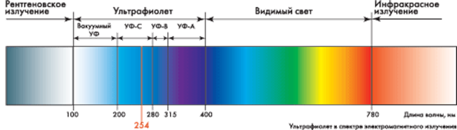 Хвилі з більшою енергією, ніж фіолетове світло, називають ультрафіолетовим випроміненням. Ультрафіолетове бактерицидне випромінення – це електромагнітне випромінення ультрафіолетового діапазону довжин хвиль в інтервалі від 205 до 315 нм.