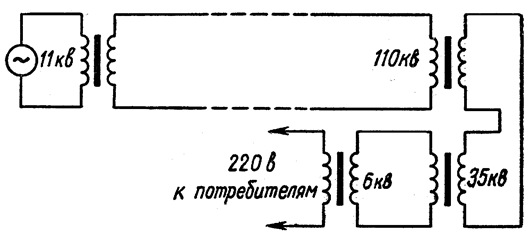 Для безпосереднього використання електроенергії в двигунах електропривода верстатів, в освітлювальній мережі і для інших цілей напруга на кінцях лінії потрібно понизити. Це досягається за допомогою понижуючих трансформаторів. Причому звичайне зниження напруги і відповідно збільшення сили струму відбувається в кілька етапів. На кожнім етапі напруга стає усе менше, а територія, охоплювана електричною мережею, - усе ширше. Схема передачі і розподілу електроенергії приведена на малюнку.