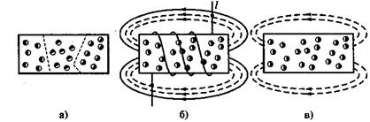 Особливу групу речовин, що намагнічуються, утворюють феромагнетики (мал. 1, а). Такі речовини, внесені в магнітне поле, під його дією намагнічуються так, що підсилюють зовнішнє магнітне поле, тобто магнітні силові лінії зовнішнього магнітного поля В і магнітного поля речовини В' мають один і той же напрям.