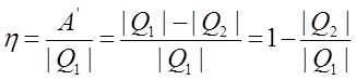 де Q1 — кількість теплоти, отримана від нагрівача, a Q2 -кількість теплоти, віддана холодильнику.
