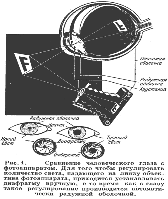 Часто око називають живою камерою Обскура, але як більшість аналогій і ця аналогія вірна лише частково. Око являє собою нескінченно більш тонкий і складний прилад, чим найкращий фотоапарат, хоча в принципі вони однакові. У фотоапараті, як показано на мал.1, мається проста збірна чи лінза система лінз, що діє подібно збірному хрусталику ока. Чуттєва плівка у фотоапараті відповідає чутливості до світла сітчастій оболонці на задній стороні ока; ту й іншу одержують перевернені, дійсні, зменшені зображення. Діафрагма регулює кількість світла, що допускається у фотоапарат; райдужна оболонка регулює кількість світла, що входить в око. У темряві чи зіниця отвір райдужної оболонки може мати діаметр майже 1див, а на яскравому світлі він має розмір шпилькової голівки.