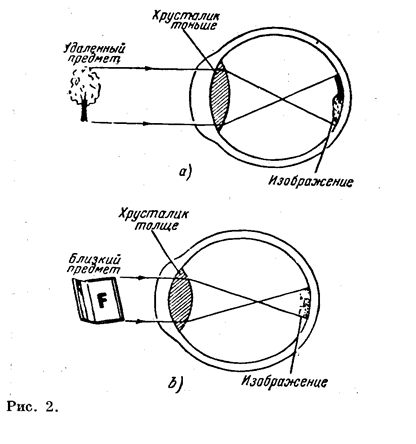 В одну мить нормальне око здатне сфокусувати чітко на сітчастій оболонці такий великий вилучений предмет як гора, а в наступну частку секунди він може дати однаково чітке зображення видрукуваного чи тексту спідометра автомашини, що знаходиться усього на відстані якого-небудь десятка сантиметрів від очей. Якби ми не мали таку здатність, нам було б важко керувати швидкохідними автомобіля і літаками, не збільшуючи кількості нещасливих випадків, яких і без того багато. Теоретично мається кілька можливих способів. Риба фокусує око, змінюючи відстань між лінзою і сітчастою оболонкою точно так само, як фокусує фотоапарат з розтяганням. Але, як ви знаєте, людське око фокусує не таким способом. Хрусталик ока просто змінює свою форму. Зі збільшенням відстані предмета, що приводить до зменшення відстані зображення, мускули, з'єднані з зовнішніми краями очного хрусталика, змушують хрусталик сплющуватися і ставати тонше. Таким чином, його фокусна відстань збільшується в достатньому ступені, і зображення різке фокусируется на сітчастій оболонці (рис 2.а).