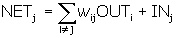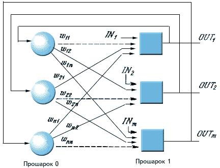 На рис. 1 показана мережа із зворотними зв'язками, що складається з двох прошарків. Спосіб представлення дещо відрізняється від використаного в роботі Хопфілда і іншого, але еквівалентний йому з функціональної точки зору, а також добре пов'язаний з мережами, розглянутими в попередніх розділах. Нульовий прошарок, як і на попередніх рисунках, не виконує обчислювальної функції, а лише розподіляє виходи мережі зворотно на входи. Кожний нейрон першого прошарку обчислює зважену суму своїх входів, даючи сигнал NET, який за допомогою нелінійної функції F перетворюється в сигнал OUT. Ці операції схожі з нейронами інших мереж.