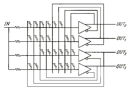 У недавніх роботах розглядалася електрична схема, заснована на мережі із зворотним зв'язком, що реалізує чотирибітовий аналогово-цифровий перетворювач. На рис. 2 показана блок-схема цього пристрою з підсилювачами, що виконують роль штучних нейронів. Опори, що виконують роль ваги, з'єднують вихід кожного нейрона з входами всіх інших. Щоб задовольнити умові стійкості, вихід нейрона не сполучався опором з його власним входом, а ваги бралися симетричними, тобто опір від виходу нейрона i до входу нейрона j мало ту ж величину, що і опір від виходу нейрона j до входу нейрона i.