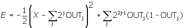 Метою є такою вибір опорів (ваг), що безперервне зростаюче напруження X, до одновходового термінала, породжує множину з чотирьох виходів, що представляють двійковий запис числа, величина якого приблизно рівна вхідній напрузі (рис. 3). Визначимо спочатку функцію енергії таким чином: