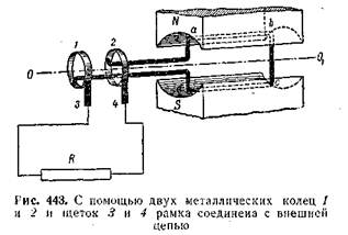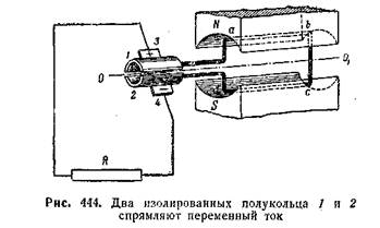 Допустимо, що контур abed (мал. 444) обертається в магнітному полі й у ньому індукується синусоїдальна електрорушійна сила. Однак активні сторони ab і cd контуру тепер приєднані не до двох контактних кілець, а до двох півкілець 1 і 2. За допомогою щіток 3 і 4, накладених на ця півкільця, контур з'єднаний зі споживачем, що має опір R.