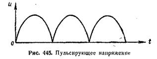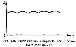 Отже, якщо на півкільцях 1 і 2 мається деяка синусоїдальна напруга, то на щітках 3 і 4 воно вже стає випрямленням і в даному випадку пульсуючим (мал. 445).