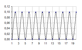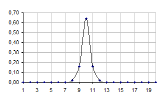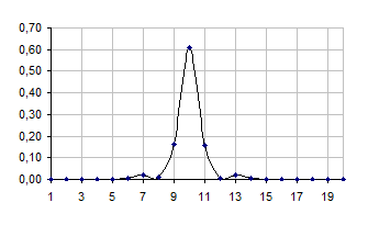 Графік 1. Квадрат амплітуди хвильової функції |yn|2 у залежності від n в початковий момент часу.