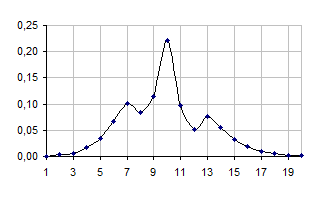 Графік 5. Квадрат амплітуди хвильової функції |yn|2 у залежності від n при t=15.