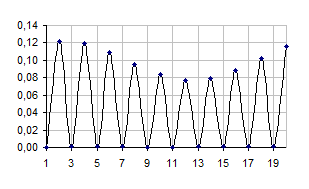 Дослід 1. g0=0,5. У початковий момент часу квадрат амплітуди хвильової функції має вигляд: