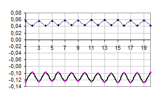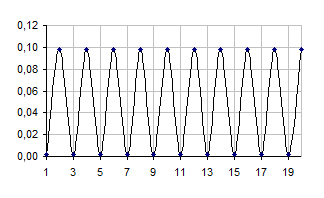Дослід 2. g0=1,8. Збільшуючи значення параметра g0, дійшли такого самого результату, як і в попередньому досліді, тобто отримали стаціонарний стан у вигляді монохроматичної хвилі. На графіках 9-14 показано еволюцію початкового збудження та перетворення його у стоячу гармонійну хвилю. Тут ми прослідкуємо зміну не тільки квадрату амплітуди хвильової функції квазічастинки, а й зміну зміщення в часі. Початкове збудження задаємо таким самим, як і в першому досліді (графік 1). Спершу коливання майже не змінюються: