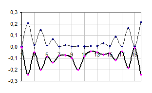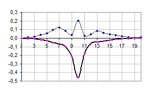 Графік 13. Квадрат амплітуди хвильової функції |yn|2 (тонка лінія) та зміщення un (товста лінія) при t=30.