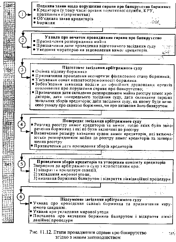 Порядок провадження справи про банкрутство, передбачений новим законодавством, суттєво відрізняється від того, який діяв до 2000 року. На рис. 11.12. показано етапи провадження справи відповідно до нового закону про банкрутство.
