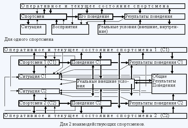 У процесі управління процесом тренування потрібно враховувати різні фактори і зв'язки між ними (на схемах жирні стрілки — прямі зв'язки, тонкі — зворотні; у головних блоків — “спортсмен”, “поведінка” — границі товстіші).