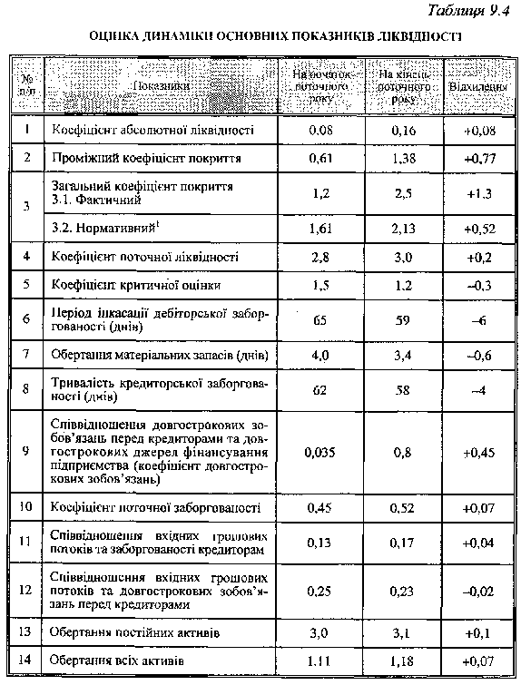 Як практичний приклад спробуємо, використовуючи основні показники табл. 9.3, оцінити ліквідність певного умовного підприємства (табл. 9.4).