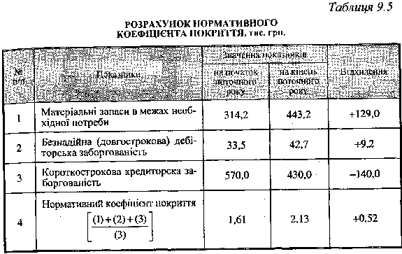 Таким чином, при зростанні за рік суми матеріальних запасів у межах необхідної потреби, безнадійної (довгострокової) заборгованості на 138,2 тис. грн. та при зниженні короткострокової кредиторської заборгованості на 140 тис. грн. нормативний коефіцієнт покриття збільшився на 0,52 пункта. Водночас фактичний коефіцієнт покриття збільшився на 1,3 пункта, тобто більше ніж удвічі.