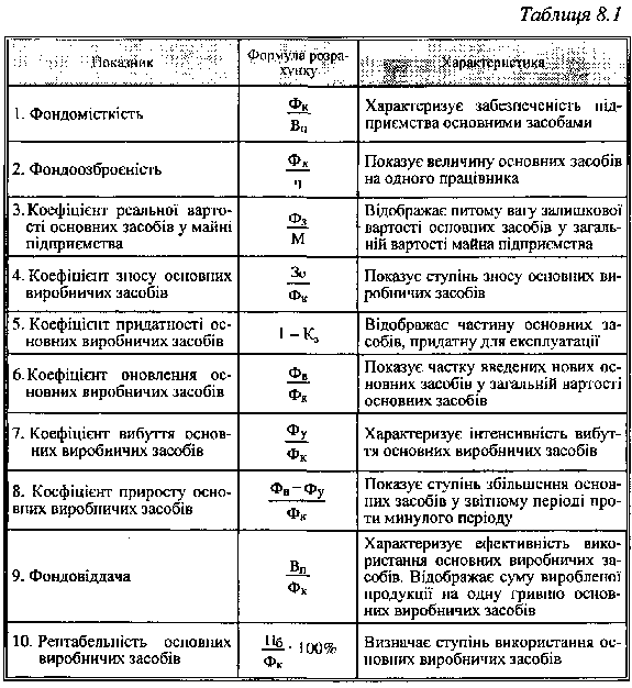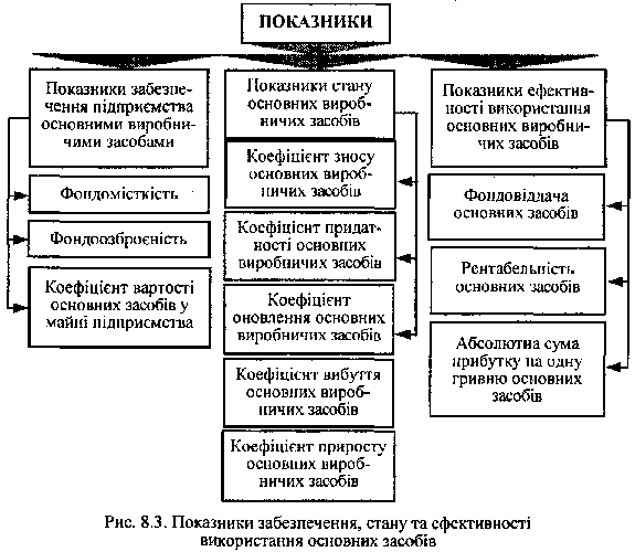 Стан основних виробничих засобів характеризують через такі коефіцієнти: зносу основних засобів; придатності; оновлення; вибуття (приросту) основних засобів (див. рис. 8.3).