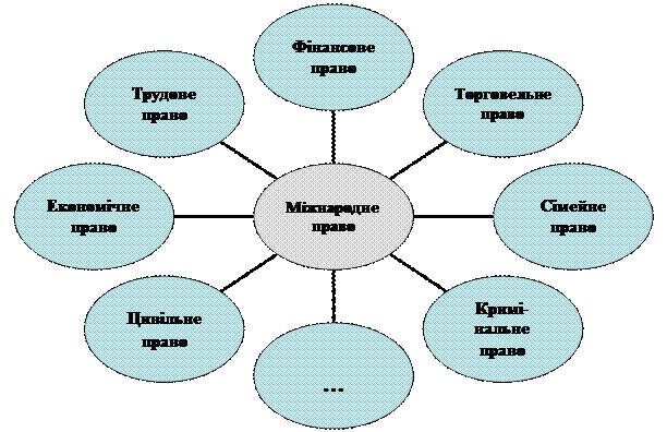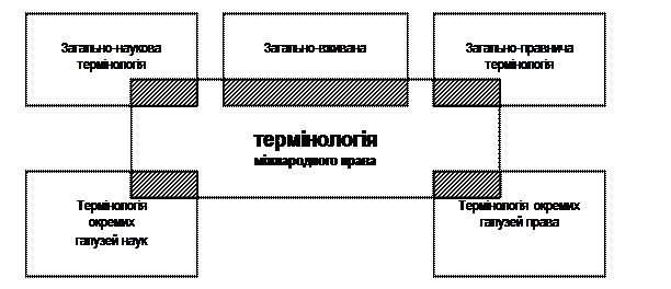 При утворенні та формуванні терміносистем важливу роль грають як екстралінгвальні фактори, що зумовлюють необхідність домінування понять галузі знань та сфер діяльності й потребу деталізувати чи ускладнити поняття фундаментальних галузей науки, так і лінгвальні, що пов’язані з різноманітністю понятійних відносин, що передаються термінами й можливістю об’єднати різні у понятійному відношенні компоненти у багатослівних термінах. Поповнення лексичного запасу терміносистем відбувається не тільки завдяки появі нових термінів (у суспільно-політичних науках це відбувається в меншою мірою ніж у науках природничих чи технічних (пов’язаних безпосередньо з дослідництвом, експериментами, виробництвом). У процесі міжгалузевих комунікацій відбувається взаємне запозичення термінів відповідними галузевими терміносистемами. Такий процес можна назвати інтеграцією терміносистем. Ми пропонуємо один із можливих варіантів наочного відображення такого процесу у терміносистемі міжнародного права. (див. мал. 1). Спостерігаємо також процес оказіонального вживання термінів тією чи іншою терміносистемою з інших термінологічних систем (див. мал. 3).