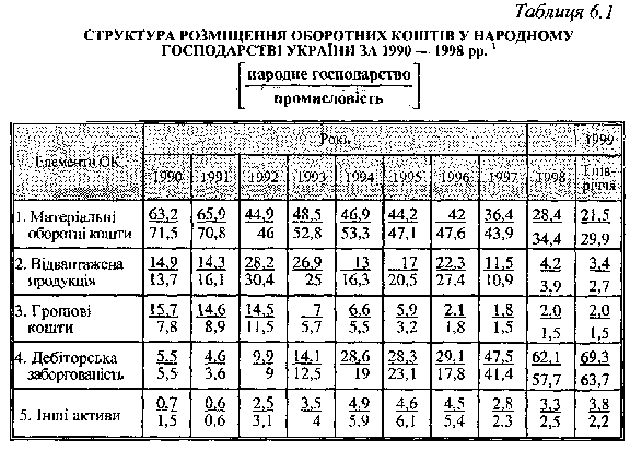 Зміни в управлінні економікою відчутно вплинули на структуру оборотних коштів промислових і непромислових підприємств України (див. табл. 6.1).