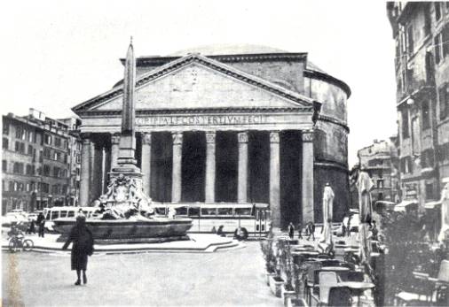 На площу Ротонди, де стоїть Пантеон, можна пройти вузенькими і кривими вуличками Риму, повз мальовничу площу Навона. Перед глядачем відкривається величний портик з трьох рядів колон корінфського ордера, що підтримують високий трикутний фронтон. За портиком видно величезний бетонний циліндр, перекритий куполом. Дивлячись на Пантеон зовні, не можна сказати, що ця споруда справляє найбільше враження порівняно з усім, що збудував стародавній Рим. Але, переступивши поріг Пантеона, мимоволі зупиняєшся в захопленні: перед нами розкривається простір незвичайної краси. Власне, усе тут просто. Гігантський купол діаметром 43,5 м перекриває круглий зал. Підлога з мармурових різнобарвних плит розчленована на квадрати і круги. Площа підлоги 1500 м2. Циліндричну стіну поділено на два яруси. У нижньому — ніші, де стояли статуї, верхній було обкладено мармуровими панелями. Жовті, рожеві, коричневі, зеленуваті тони мармурів створювали теплу кольорову гаму. Усе навколо ніби було оповите золотистим серпанком. Але головне — це купол. Він вільно лежить на міцних стінах. Його ніщо не прикрашає. Просто над ним звелися вгору величезні ребра бетонної кесонної конструкції. Його горизонтальний розпір гаситься в самій конструкції. Тому велика товщина купола внизу, поступово зменшується вгору. Зодчі майстерно зменшили вагу купола, розчленувавши його кесонами і використавши у верхніх його частинах щебінку з легких матеріалів. З висоти 42 м через отвір купола діаметром 9 м ллється потік сонячних променів, які відсвічуються на поверхні мармуру і розбризкуються на всі боки. Такого купола стародавній світ не знав. Навіть візантійські майстри, великі спеціалісти по спорудженню куполів, не змогли його перевершити. При всій раціоналістичності ідеї художня виразність Пантеона надзвичайна. Усі його частини перебувають у цілковитій гармонії: Пантеон — це натхненний витвір митця, гімн людському розуму.