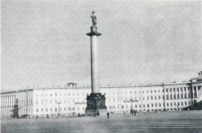 Россі споруджує на площі напроти Зимового палацу два корпуси Генерального штабу і урядових установ і об'єднує їх великою (17 м завширшки і 27 м заввишки) тріумфальною аркою, що була задумана як своєрідний пам'ятник перемоги у Вітчизняній війні 1812 р. Видатні скульптори тих часів С. С. Пименов і В. І. Демут-Малиновський виконали скульптурні оздоби, у тому числі велику (10 м заввишки) скульптурну групу «Перемога», що увінчує арку. Бокові корпуси мають спокійні, величні форми, їх прості фасади у центрі ускладнюються колонадами. Всю споруду Россі розташував дугою, що близька за формою до параболи, переключивши таким чином основний акцент з царського палацу на монумент, присвячений перемозі російського народу. Посередині площі в 1834 р. за проектом О. Монферрана було поставлено Олександрійську колону — знову-таки на честь перемоги російського народу у війні 1812 р. Колона заввишки 47,5 м стала домінантою площі. Зроблено її було з моноліту фінляндського граніту вагою 600 т. Тепер Зимовий палац стає лише фоном для архітектурних споруд, присвячених вікопомній події 1812 р. Ансамбль остаточно завершив А. П. Брюллов, збудувавши в 1837-1843 рр. між Зимовим палацом і Генеральним штабом будинок штабу гвардійських військ також у класицистичних формах. Розміри площі великі (дуга Генерального штабу витягнулась на 580 м), проте вона здається ще більшою від гармонійного поєднання її частин. Особливо гарною вона буває надвечір, коли на фасад Зимового палацу і під арку Генерального штабу лягають глибокі тіні, а яскраво освітлена ліва частина дуги штабу контрастує з фіалковими сутінками площі.
