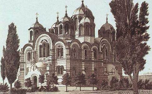 Коли над Дніпром зводився монумент князеві Володимиру – хрестителю Русі, побожні кияни дивувалися: Володимир, мовляв, ідолів скинув, а сам нині як ідол постає. Тож 1852 року почалося збирання пожертв на будівництво на честь рівноапостольного князя. Тридцятирічний петербуржець іван Штром – архітектор, який збудував у Києві Кадетський корпус на сучасному Повітрофлотському проспекті, - отримав замовлення на розробку проекту. Він запропонував вирішити собор у величних візантійських формах, як за часів Володимира. За його думкою, майбутній собор мали увінчувати аж тринадцять бань. Креслення Штрома затвердив імператор Микола І.
