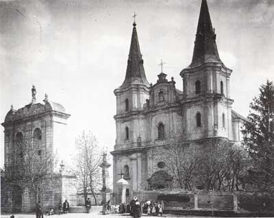 2. Опис. 2.1. Костел 2.1.1. Архітектура Костел розміщений на північ від ринку містечка Гвіздець і скерований на схід. Мурований з цегли, з використанням каменя, штукатурений. Однонефовий з мілким трансептом, не зовсім квадратовим презбітеріумом, замкнений прямою стіною. До презбітеріуму від півночі прилягає прямокутна комора, а від півдня - захристія і стіни кляштору. Неф типу стіноколонний має властиве прясло, до якого зі східного боку прилягає півпрясло, яке відрізняється через розбудовану артикуляцію стін і склепіння. Так само із заходу є додатково продовжений такий самий вигляд на відстані, що служили для розміщення музичного хору, який з'єднується з вежами в їх основі. Артикуляція стін нефу зроблена з допомогою спарованих композиційних пілястр, які завершуються оздобленням: литтям аканту на капітелях, виконаних в художній техніці. Вони розміщені на однаковій широкорозставлені в певному співвідношенні і здвоєні на внутрішній стороні. В трансепті і пресбітеріумі стіни розділяють поодинокі пілястри, які двостороннє здвоєні. Підтримують вони виступаючі над ними карнизи, що є в усьому костелі і перервані лише на західній стіні. В бічних стінах нефу - широкі виступи у вигляді полиць профільованих архівольтами з виступами досередини. Частина стін між спареними пілястрами в нефі легко сприймаються. Склепіння нефу і презбітеріум, і прясла перехрещуються з особливими подвійними гуртами, що утворюють вузькі впадини над півпряслами, а також над плечима трансепту. Це все розміщене тут вертикально до осі костелу. Вікна понад карнизами в нефі, презбітеріумі і трансепті прямокутні, оточені рамами. В нижній частині нефа і трансепті вікна малі і овальні. В порталі при вході до комори і захристії двері прямокутні, профільовані і мають прямокутні причілки. Між пілястрами прямокутна плита оточена прямокутно-опуклою рамою В товщині муру є сходи, що ведуть на амвон. Хори музичні, спираються на дві колони. Підпори тримають профільований гжимс, вище якого є парапет у формі аттика, оздобленого плитками. Зі сторони південної вежі з кляштору через сходову площадку є доступ на хори. Фасад костела, з погляду на розміщення веж, є значно ширший від нефу. Середня частина є одноплощинна, двоповерхова, зв'язана з бічними вежами. Завдяки особливим триповерховим фланкованим вежам костел чудово виділяється на навколишньому фоні. Лінія фасаду особливо гармонійна з випуклою серединною частиною м'якими внутрішніми зарисованими увігнутими лініями елеваціями веж і глибокими заглибинами на стиках між всіма частинами. Поверхи виразні через широкі паси, спільні для середньої частини і веж, з ледь помітними архітравами і фризами , але в основному вони особливі. Вертикальна артикуляція зроблена на першому поверсі за допомогою тосканських пілястрів, на другому і третьому - виступи. Особливо на кутах нижнього поверху веж зроблені важливі колони в псевдокапітелях, утворених з виступаючих балок. Скріплення середнього поля має спрощений вигляд, складений з композиційних пілястрів в канелюрах, які фланкуються через з'єднані волюти, і які підтримують вигнуті вгору карнизи з постаментом на осі. Волютні з'єднання вміщують Всевидяче Око, увінчане хрестом, а по боках - кам'яні вазони. На осі середньої площини фасаду є прямокутний вхідний отвір профільований ошатним об