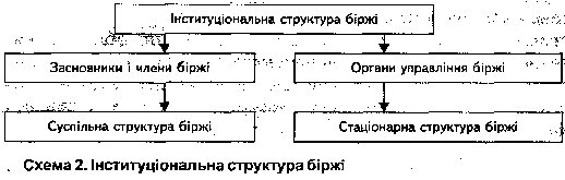 Управління біржовими інститутами здійснюється трьома органами, компетенція яких різна і функції яких можуть мати специфіку на різних біржах: загальні збори членів біржі (пайовиків) і засновників, біржовим комітетом (радою директорів), виконавча дирекція. Організація біржового управління визначається її інституціональною структурою, яка може бути представлена у вигляді такої схеми: