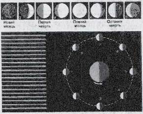 Фази Місяця. Місяць рухається навколо Землі в той самий бік, у який Земля обертається навколо своєї осі. Відображенням цього руху, як ми знаємо, є видиме переміщення Місяця на фоні зір назустріч обертанню неба. Щодоби Місяць зміщується на схід відносно зір приблизно на 13°, а через 27,3 доби повертається до тих самих зір, описавши на небесній сфері повне коло.