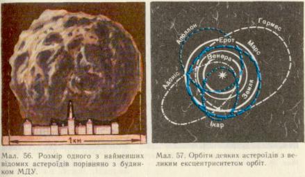 Найяскравіший астероїд — Веста не буває яскравішим від 6-ї зоряної величини. Найбільший астероїд — Церера. Його діаметр близько 800 км, і за орбітою Марса навіть у найсиль-ніші телескопи на такому малому диску нічого не можна побачити. Діаметр найменших відомих астероїдів становить лише близько кілометра (мал. 56). Звичайно, астероїди не мають атмосфери. На небі малі планети схожі на зорі, тому їх назвали астероїдами, що в перекладі з давньогрецької означає «зореподібні». Як і для планет, для них характерне петлеподібне переміщення на фоні зоряного неба. Орбіти деяких астероїдів мають незвичайно великі ексцентриситети. Внаслідок цього в перигелії астероїди підходять до Сонця ближче, ніж Марс і Земля, а Ікар — ближче, ніж Меркурій (мал. 57). У 1968 р. Ікар наблизився до Землі на відстань менш як 10 млн. кілометрів, але його зовсім незначне притягання ніяк не вплинуло на Землю. Часом близько підходять до Землі Гермес, Ерот та інші малі планети.