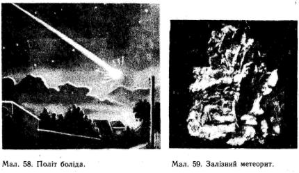 вання, і навколо неї утворюється обширна світна оболонка з розжарених газів. Боліди часто мають помітний кутовий діаметр, і їх видно навіть удень. Марновірні люди вважали такі вогненні кулі літаючими драконами з вогнедишною пащею. Від сильного опору повітря метеорне тіло нерідко розколюється і з гуркотом падає на Землю у вигляді осколків. Рештки метеорних тіл, що впали на Землю, називаються метеоритами.