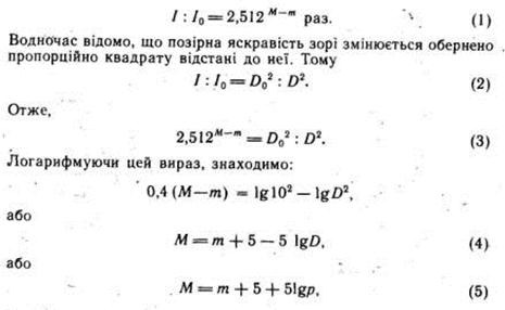 Розглянемо кількісне співвідношення видимої й абсолютної зоряних величин зорі при відомій відстані О до неї (або її паралаксі р). Пригадаємо спочатку, що різниця 5 зоряних величин відповідає відмінності яскравості рівно в