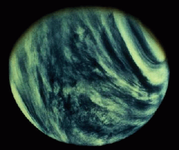 Зображення Венери в ультрафіолетовому діапазоні, отримане 7 лютого 1974 р. АМС "Маринер-10" з відстані 720000 км. Зображення побудоване на основі мозаїки кадрів, оброблених комп'ютером і потім відретушованих. В ультрафіолетових променях виділяються пояси хмар, хоча у видимому світлі структура зображення майже нерозрізнене через непрозору атмосферу. |