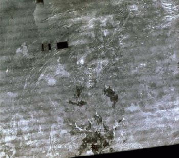 Отримана з "Магеллана" радіолокаційна мозаїка ділянки рівнини Навка шириною 400 км, на якому позначений район посадки апарата , що спускається, радянської АМС "Венера-8". |