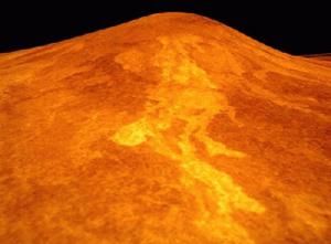 Перспективний вигляд венерианскої вулканічної гори Сів в умовних кольорах, отриманий на основі радіолокаційних зображень з "Магеллана". Вулкан має 300 км у діаметрі і 2 км у висоту. |