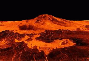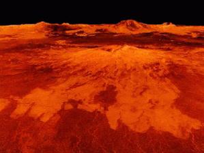 Вигляд ділянки поверхні Венери в умовних кольорах, отриманий на основі радіолокаційних зображень з "Магеллана". На передньому плані видна гора Шапаш висотою 1,5 км і 400 км у поперечнику. На задньому плані на обрії можна бачити гору Маат. |