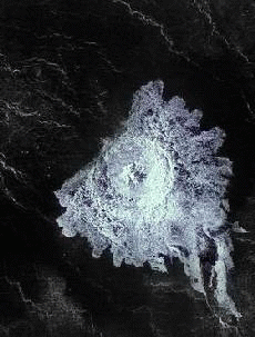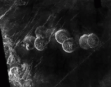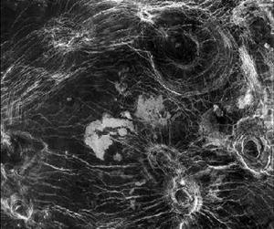 Отримана з "Магеллана" радіолокаційна мозаїка, що дає зображення вулканічних структур, відомих за назвою "павутина". Такі утворення дотепер знайдені тільки на Венері. Розміри видимих на зображенні структур коливаються від 50 до 230 км. |
