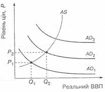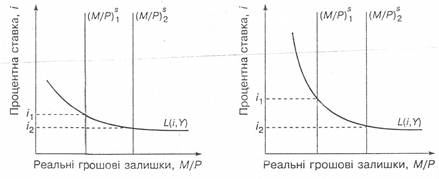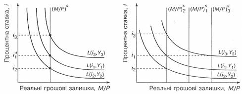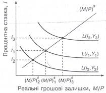 Якщо ж крива попиту переміщуватиметься у положення L(і3, Y3) і процентна ставка повзтиме вгору, то центральний банк може стабілізувати процентні ставки, купуючи державні облігації, що не допустить зниження цін на облігації. Центральний банк купуватиме облігації доти, доки пропозиція грошей не збільшиться до (М/Р)^, а процентна ставка не встановиться на рівні /,. Як бачимо, стабілізація процентних ставок передбачає зміну пропозиції грошей.