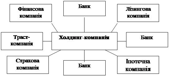 Ще більша ступінь спеціалізації досягається в банківській холдинг-компанії. Вона дуже схожа на попередню модель, оскільки дочірні філіали холдингу також володіють самостійністю, але існують